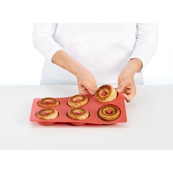 Molde para dónuts fabricados 100% en Silicona Platino, un material de gran calidad, durabilidad y resistencia que permite su uso entre -60º y +220º, lo que los hace aptos para ser utilizados en horno, microondas y congelador.
